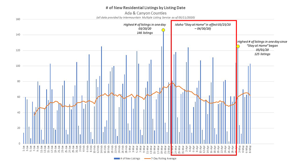 According to data provided by the Intermountain MLS, 125 new listings were placed on the market on May 1st – the highest number in any one day since March 20th, before the "Stay in Place" order was issued in Idaho. Additionally, the number of accepted sale contracts jumped to 79 on May 4th, which was the highest number of new pending sales since March 9th.